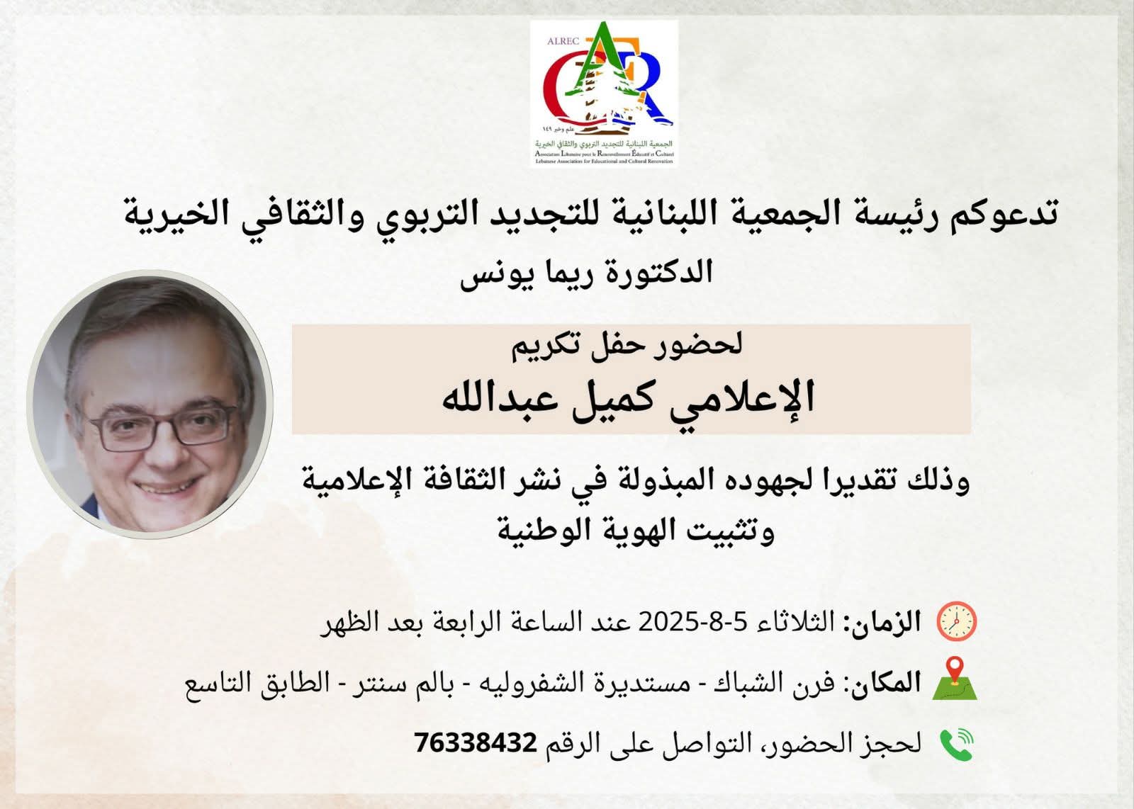 تدعوكم رئيسة Alrec الجمعية اللبنانية للتجديد التربوي والثقافي الخيرية الدكتورة ريما يونس لحضور حفل تكريم